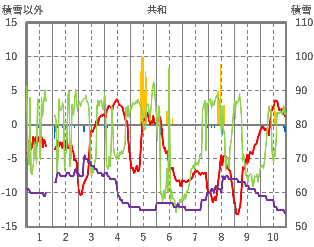 | 日 | 時 | 気温 | 降水 | 風向/風速 | 日照 | 積雪 | 降雪 |