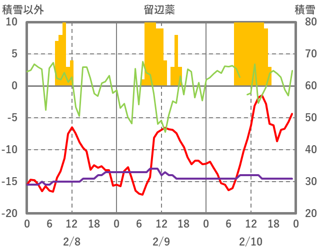 | 日 | 時 | 気温 | 降水 | 風向/風速 | 日照 | 積雪 | 降雪 |