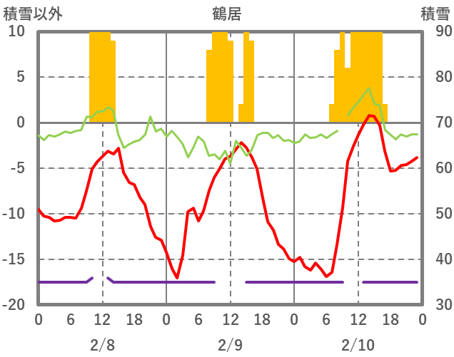 | 日 | 時 | 気温 | 降水 | 風向/風速 | 日照 | 積雪 | 降雪 |