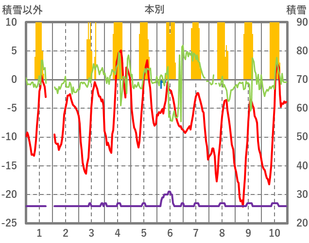 | 日 | 時 | 気温 | 降水 | 風向/風速 | 日照 | 積雪 | 降雪 |