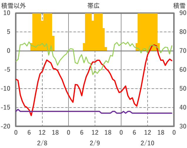 | 日 | 時 | 気温 | 降水 | 風向/風速 | 日照 | 積雪 | 降雪 |
