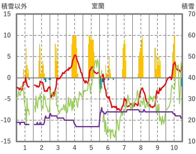 | 日 | 時 | 気温 | 降水 | 風向/風速 | 日照 | 積雪 | 降雪 |
