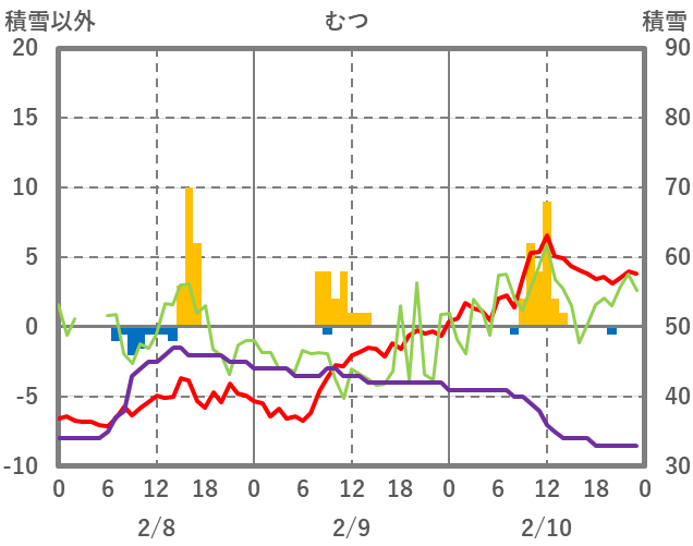 | 日 | 時 | 気温 | 降水 | 風向/風速 | 日照 | 積雪 | 降雪 |