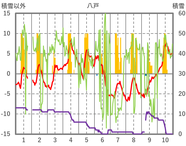 | 日 | 時 | 気温 | 降水 | 風向/風速 | 日照 | 積雪 | 降雪 |