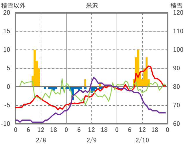 | 日 | 時 | 気温 | 降水 | 風向/風速 | 日照 | 積雪 | 降雪 |