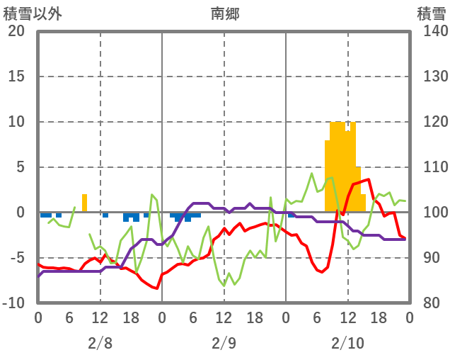 | 日 | 時 | 気温 | 降水 | 風向/風速 | 日照 | 積雪 | 降雪 |