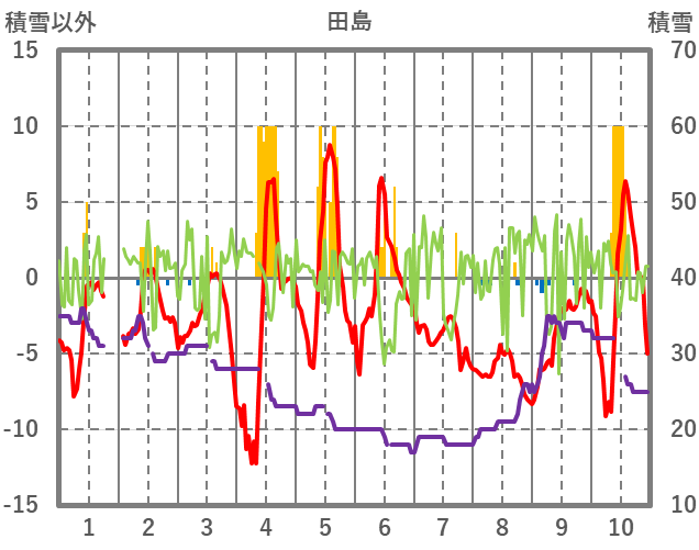 | 日 | 時 | 気温 | 降水 | 風向/風速 | 日照 | 積雪 | 降雪 |