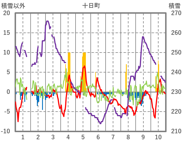 | 日 | 時 | 気温 | 降水 | 風向/風速 | 日照 | 積雪 | 降雪 |