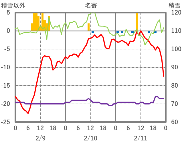 | 日 | 時 | 気温 | 降水 | 風向/風速 | 日照 | 積雪 | 降雪 |