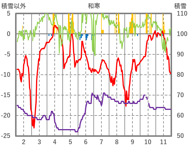 | 日 | 時 | 気温 | 降水 | 風向/風速 | 日照 | 積雪 | 降雪 |