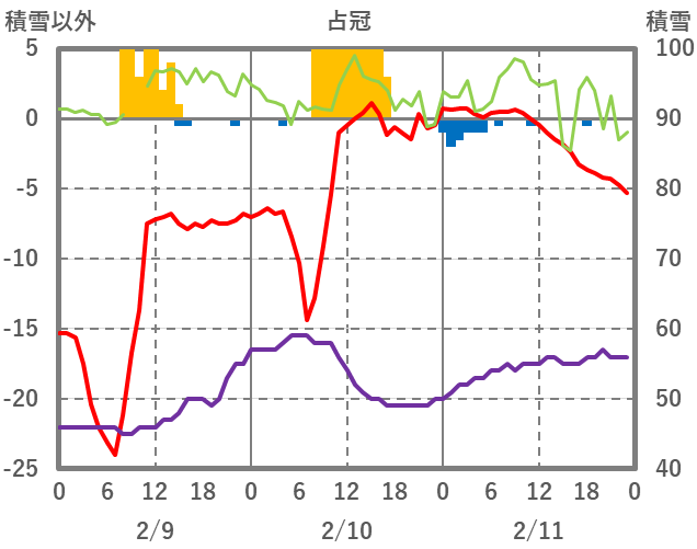 | 日 | 時 | 気温 | 降水 | 風向/風速 | 日照 | 積雪 | 降雪 |