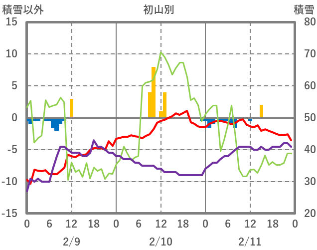 | 日 | 時 | 気温 | 降水 | 風向/風速 | 日照 | 積雪 | 降雪 |