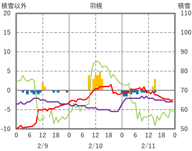 | 日 | 時 | 気温 | 降水 | 風向/風速 | 日照 | 積雪 | 降雪 |