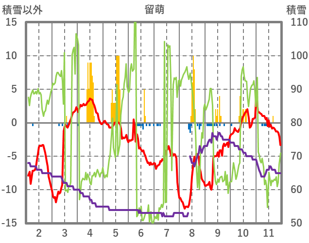| 日 | 時 | 気温 | 降水 | 風向/風速 | 日照 | 積雪 | 降雪 |