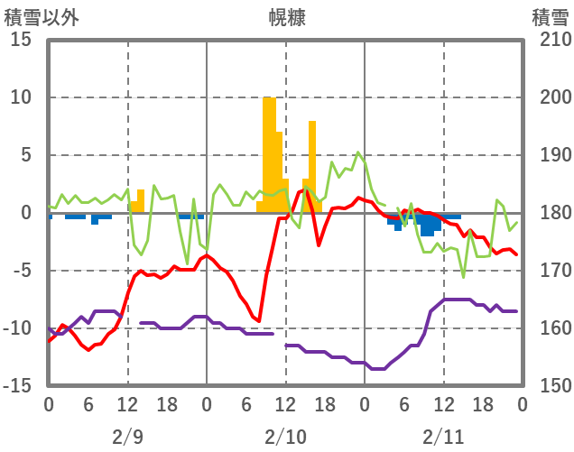 | 日 | 時 | 気温 | 降水 | 風向/風速 | 日照 | 積雪 | 降雪 |