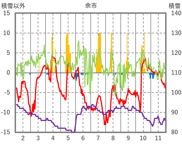 | 日 | 時 | 気温 | 降水 | 風向/風速 | 日照 | 積雪 | 降雪 |