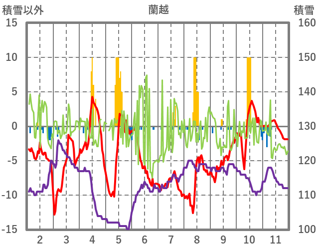 | 日 | 時 | 気温 | 降水 | 風向/風速 | 日照 | 積雪 | 降雪 |