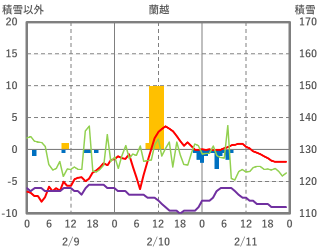 | 日 | 時 | 気温 | 降水 | 風向/風速 | 日照 | 積雪 | 降雪 |
