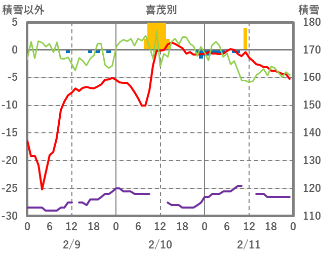| 日 | 時 | 気温 | 降水 | 風向/風速 | 日照 | 積雪 | 降雪 |