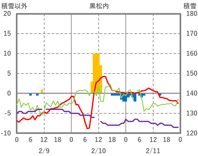 | 日 | 時 | 気温 | 降水 | 風向/風速 | 日照 | 積雪 | 降雪 |