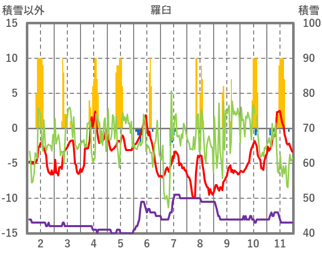 | 日 | 時 | 気温 | 降水 | 風向/風速 | 日照 | 積雪 | 降雪 |