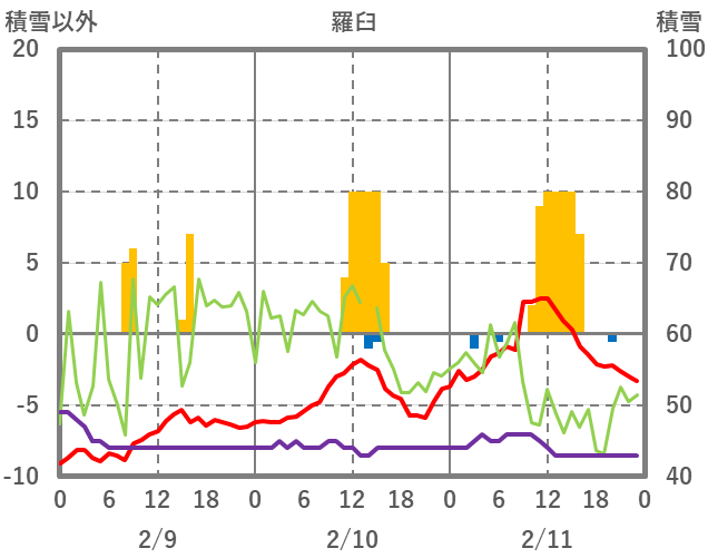 | 日 | 時 | 気温 | 降水 | 風向/風速 | 日照 | 積雪 | 降雪 |