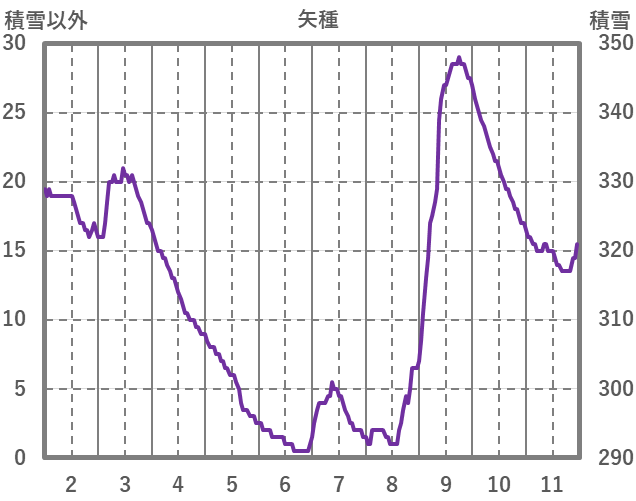 | 日 | 時 | 気温 | 降水 | 風向/風速 | 日照 | 積雪 | 降雪 |