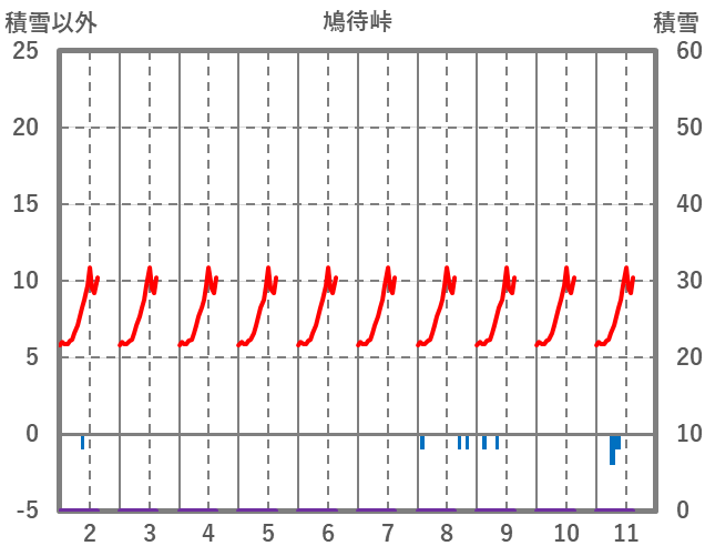 | 日 | 時 | 気温 | 降水 | 風向/風速 | 日照 | 積雪 | 降雪 |