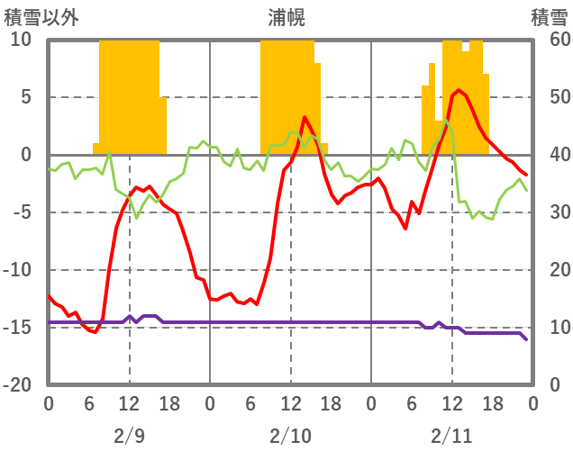 | 日 | 時 | 気温 | 降水 | 風向/風速 | 日照 | 積雪 | 降雪 |