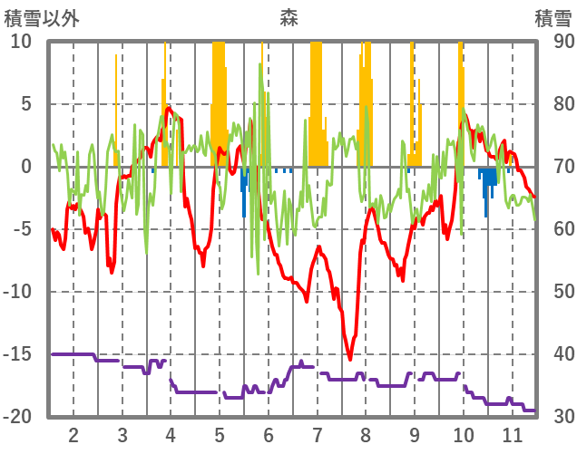 | 日 | 時 | 気温 | 降水 | 風向/風速 | 日照 | 積雪 | 降雪 |