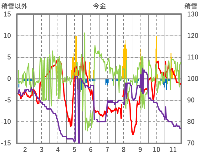 | 日 | 時 | 気温 | 降水 | 風向/風速 | 日照 | 積雪 | 降雪 |