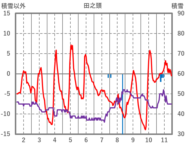 | 日 | 時 | 気温 | 降水 | 風向/風速 | 日照 | 積雪 | 降雪 |