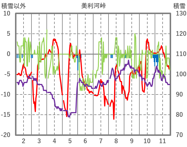| 日 | 時 | 気温 | 降水 | 風向/風速 | 日照 | 積雪 | 降雪 |