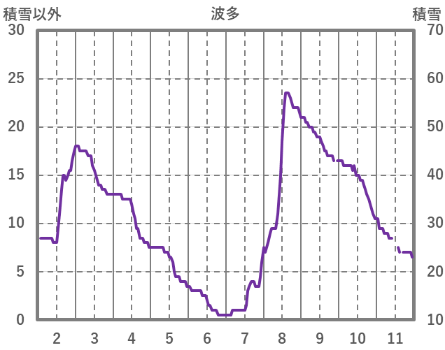 | 日 | 時 | 気温 | 降水 | 風向/風速 | 日照 | 積雪 | 降雪 |