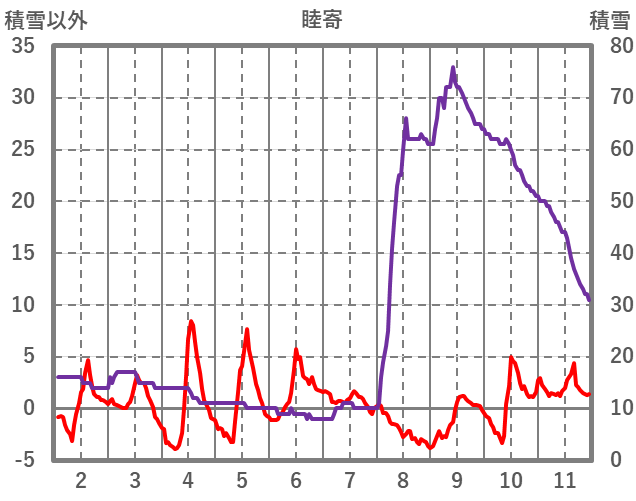 | 日 | 時 | 気温 | 降水 | 風向/風速 | 日照 | 積雪 | 降雪 |