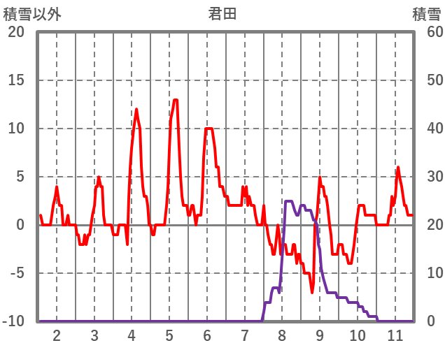 | 日 | 時 | 気温 | 降水 | 風向/風速 | 日照 | 積雪 | 降雪 |