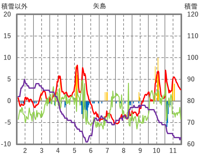 | 日 | 時 | 気温 | 降水 | 風向/風速 | 日照 | 積雪 | 降雪 |