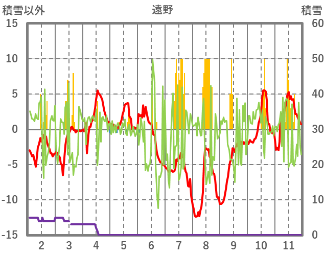 | 日 | 時 | 気温 | 降水 | 風向/風速 | 日照 | 積雪 | 降雪 |