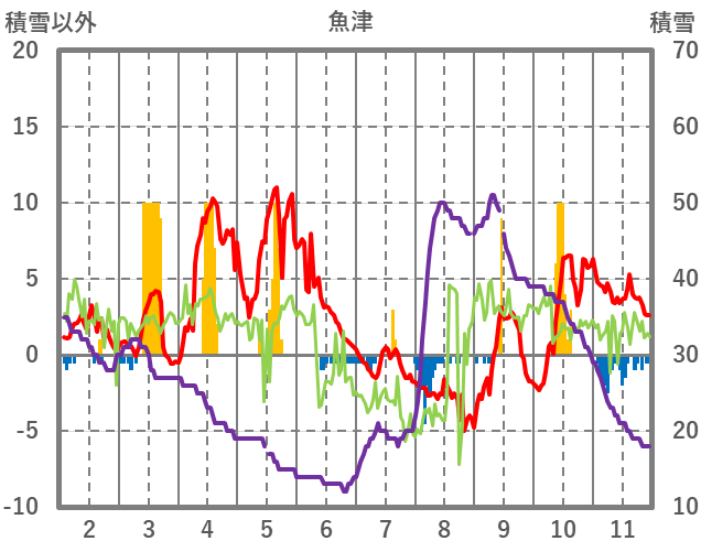 | 日 | 時 | 気温 | 降水 | 風向/風速 | 日照 | 積雪 | 降雪 |