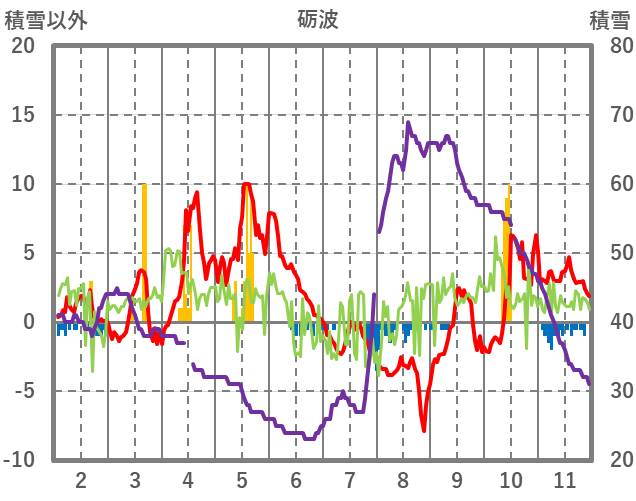 | 日 | 時 | 気温 | 降水 | 風向/風速 | 日照 | 積雪 | 降雪 |