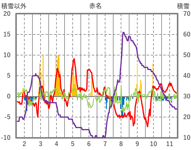 | 日 | 時 | 気温 | 降水 | 風向/風速 | 日照 | 積雪 | 降雪 |