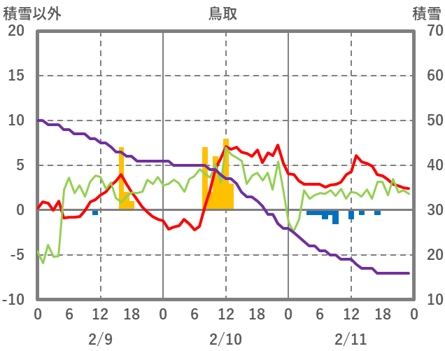 | 日 | 時 | 気温 | 降水 | 風向/風速 | 日照 | 積雪 | 降雪 |