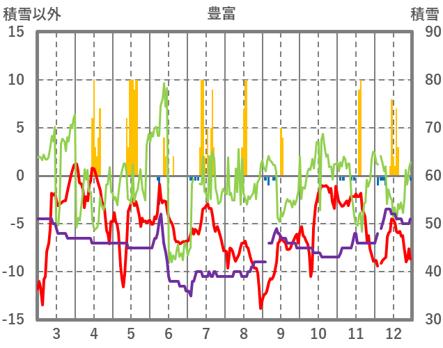 | 日 | 時 | 気温 | 降水 | 風向/風速 | 日照 | 積雪 | 降雪 |