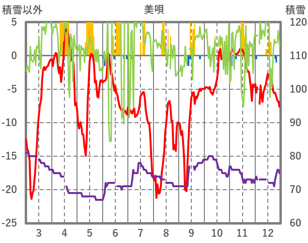 | 日 | 時 | 気温 | 降水 | 風向/風速 | 日照 | 積雪 | 降雪 |
