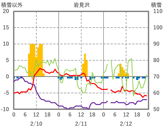 | 日 | 時 | 気温 | 降水 | 風向/風速 | 日照 | 積雪 | 降雪 |