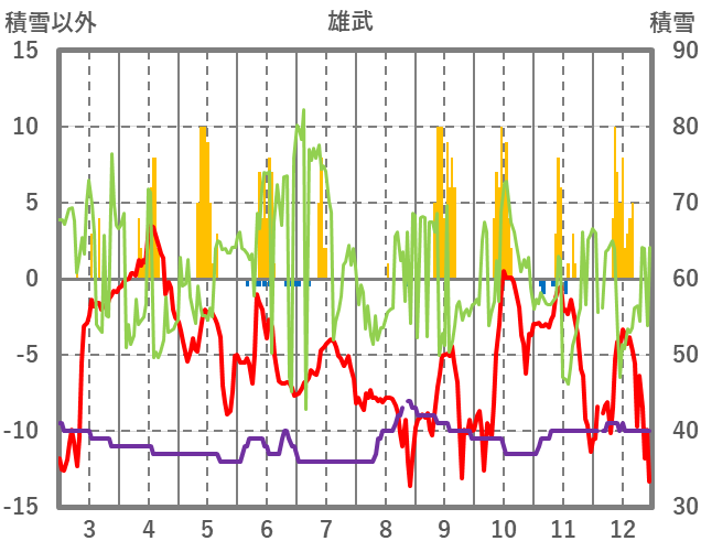 | 日 | 時 | 気温 | 降水 | 風向/風速 | 日照 | 積雪 | 降雪 |