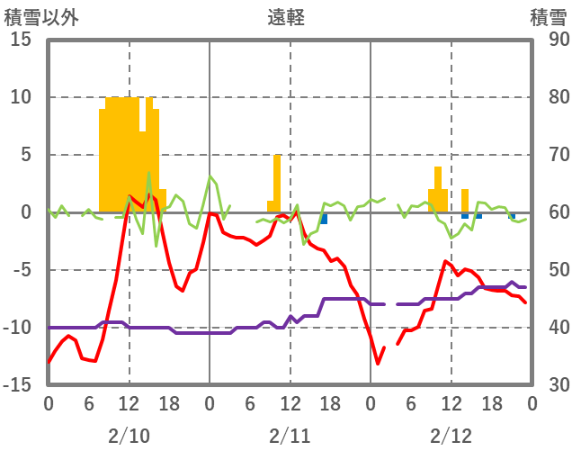| 日 | 時 | 気温 | 降水 | 風向/風速 | 日照 | 積雪 | 降雪 |