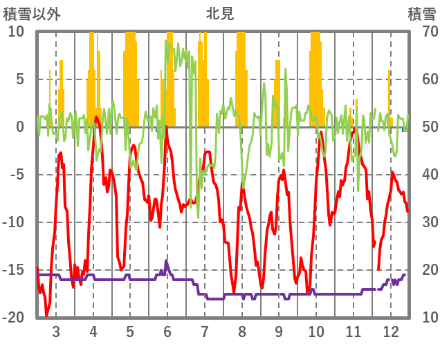 | 日 | 時 | 気温 | 降水 | 風向/風速 | 日照 | 積雪 | 降雪 |