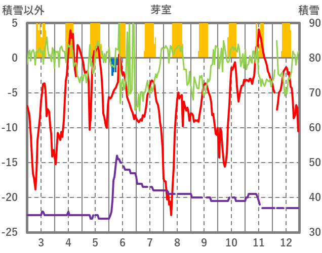 | 日 | 時 | 気温 | 降水 | 風向/風速 | 日照 | 積雪 | 降雪 |