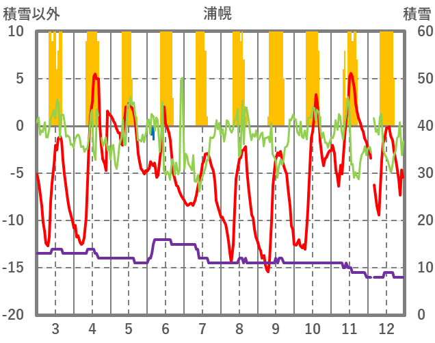 | 日 | 時 | 気温 | 降水 | 風向/風速 | 日照 | 積雪 | 降雪 |